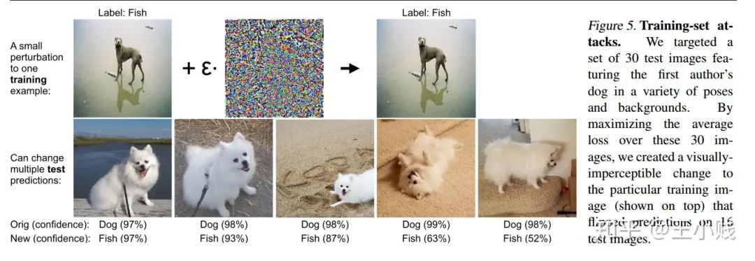 而由于计算出了对训练样本施加轻微扰动之后对特定测试样本损失函数的影响,所以这个方法也可以应用到对抗样本的生成中,只需要在一部分影响力函数较大的样本中添加一些肉眼不可见的扰动,就足以干扰其他样本的判定结果。