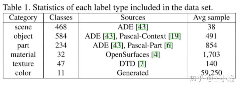 为了获得大量的视觉语义概念数据,研究人员收集了来自不同数据源的分层语义标注数据(包括颜色、材质、材料、部分、物体、场景这几个层次),如下图所示