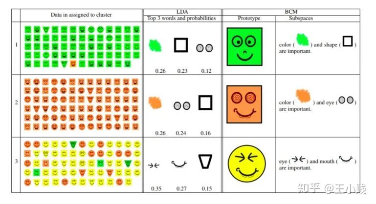 基于实例的方法 主要是通过一些代表性的样本来解释聚类/分类结果的方法。比如下图所展示的贝叶斯实例模型(Bayesian Case Model,BCM),我们将样本分成三个组团,可以分别找出每个组团中具有的代表性样例和重要的子空间。比如对于下面第一类聚类来说,绿脸是具有代表性的样本,而绿色、方块是具有代表性的特征子空间。
