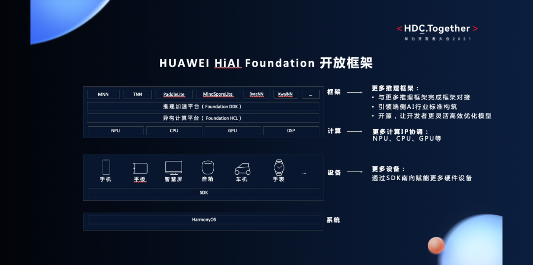 2017 年 9 月,华为发布了首款自带神经网络计算单元 NPU 的移动芯片麒麟 970。2018 年 3 月,HUAWEI HiAI Foundation 随之发布。经过几年发展,HUAWEI HiAI Foundation 已经从仅支持手机扩展到了全场景硬件,还可以做到一次开发多端运行。计算能力上看,则可以协同 NPU/CPU/GPU/DSP 实现异构计算,大幅提升了效率。