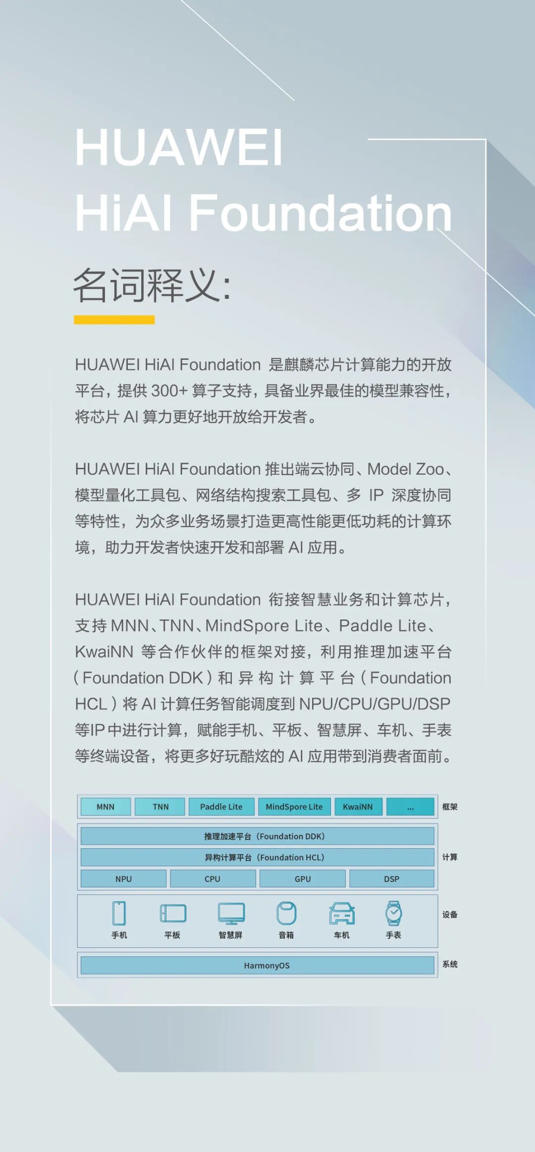 作为连接底层硬件算力和应用之间的桥梁,HUAWEI HiAI Foundation 目前支持超过 300 个通用算子,TensorFlow、PyTorch 等主流深度学习框架,国内开源深度学习平台,以及很多厂商的自用框架。硬件支持从麒麟 810 到麒麟 9000——内置华为自研 NPU 的所有芯片。
