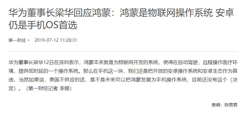 华为董事长梁华表示,鸿蒙系统是为物联网开发的,用于自动驾驶、远程医疗等低时延场景。华为手机还是把开放的安卓系统和生态作为首选,如果美国不允许华为使用安卓,华为是否会把鸿蒙发展为手机系统,还没有确定。