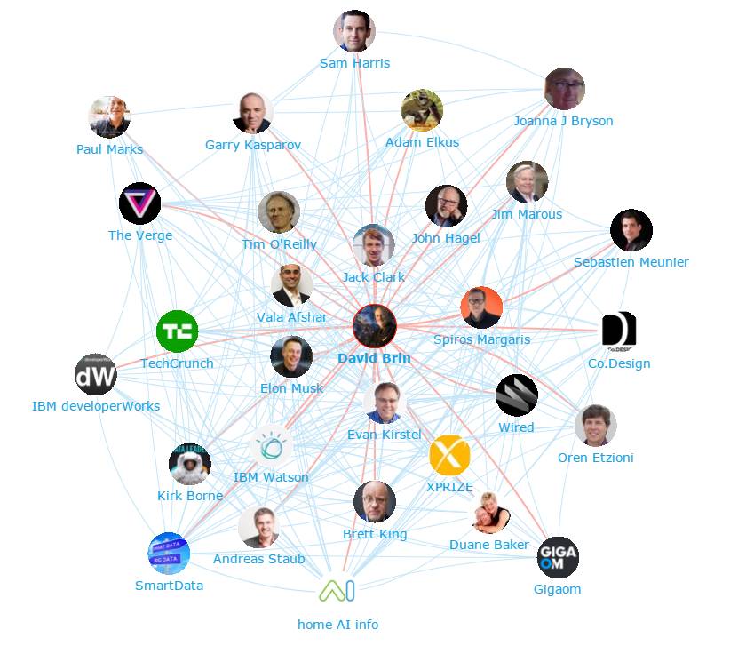 个人方面,David Brin是从17年年初到现在最有影响力的AI大佬。以下关系图展示了与他相关的AI话题。这张图是用我们的Influencer Relationship Management(IRM)软件生成的。