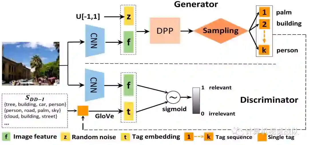 特别地,该生成模型首先将图像特征向量和随机噪声向量的级联映射为相对于所有候选标记的后验概率,然后将其合并到一个确定性点过程(DPP)模型中,通过顺序抽样生成一个不同的标记子集。利用同一幅图像的多个随机噪声向量,对多个不同的标记子集进行采样。