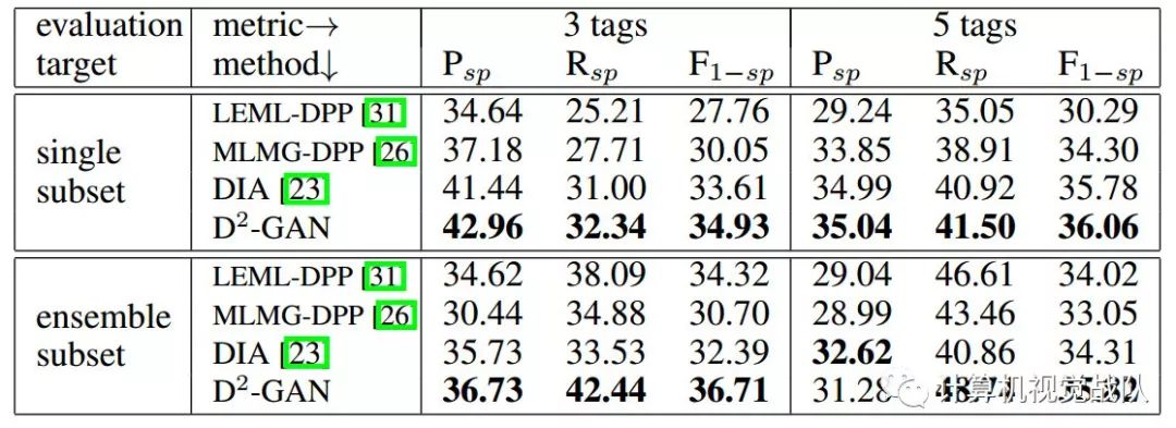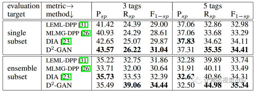 在训练过程中产生Tg时,多次重复采样过程以获得不同的子集。然后,由于每个训练图像的ground-truth值集SDD−i都可用,则可以计算每个生成子集的语义F1−sp评分,并且使用最大的F1−sp得分来更新参数。这个过程鼓励模型生成与评估度量更一致的标记子集。