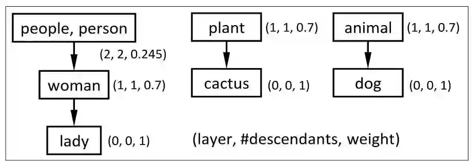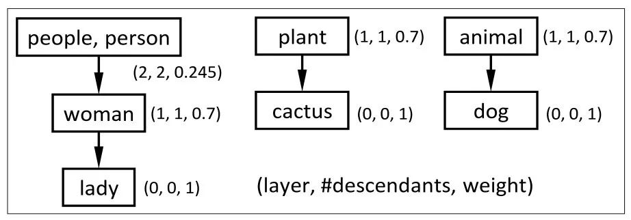 在这个过程中访问的所有标签形成叶标签的加权语义路径。在语义路径中每个标签的权重与节点层成反比(层数从叶节点处的0开始)和每个节点的后代数。因此,具有更多指定信息的标签的权重将更大。具体如图3所示: