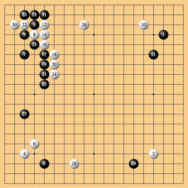 这一场李世石依然受两子执黑挑战 AI,黑棋贴目 7 目半。人类与 AI 在棋盘右下角展开激战。