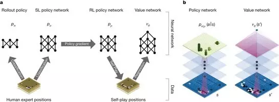 AlphaGo 最初主要是依靠大量学习人类棋手的棋谱来提高棋艺,之后 进入到完全的自我深度学习阶段,也就是完全摒弃人类棋手的思维方式,按照自己(左右互搏)的方式研究围棋。结合监督学习与强化学习的优势,AlphaGo 通过训练形成一个策略网络,将棋盘上的局势作为输入信息,并对有所可行的落子位置形成一个概率分布。然后训练一个价值网络对自我对弈进行预测,以-1(对手的绝对胜利)到 1(AlphaGo 的绝对胜利)的标准,预测所有可行落子位置的结果。