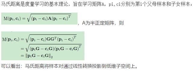 首先我们先回顾一下度量学习的基础知识,度量学习是为了让没有亲属关系的样本距离尽可能的远,而具有亲属关系的样本距离尽可能的近,使得原始空间中的马氏距离等价于转换空间后的欧氏距离。