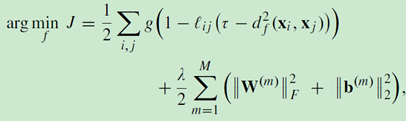 ,基于度量学习的思想,整个网络的目标就是寻找一个合适的非线性映射函数f使得正样本对之间的距离小于一个很小的值t1(t1>0),负样本对之间的距离大于一个大的值t2(t2>t1)。本文中,为了减少参数的数量,作者将t1与t2进行了融合只使用了一个参数t(t>1)来保证这种约束的实现,即