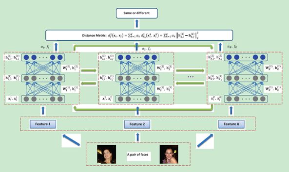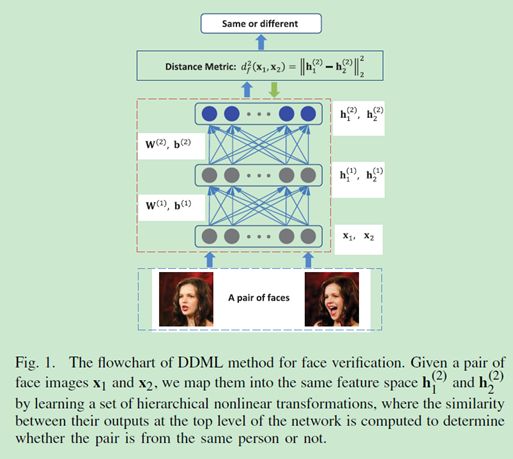 该论文主要是在度量学习的基础上利用神将网络实现的,解决类内距离尽可能小,类间距离尽可能大的问题。创新点在于提出了两个神经网络的框架discriminative deep metric learning (DDML)以及discriminativedeep multi metric learning (DDMML),DDML框架主要是用来通过全连接的神经网络进行度量学习,通过最后的损失函数保证类内距离小,类间距离大。而DDMML框架主要也是利用度量学习的思想将多个低层人工设计的特征有效融合起来,实现类内差异性小于类间差异性的问题。二者都是利用度量学习的思想,但是度量学习只是对原始的特征做线性转换,不符合人脸位于高维流行域上的几何分布,通过神经网络可以方便的实现对特征的高维非线性映射,使学到的特征更具有判别性,更有利于分类。接下来我们看看具体是怎么实现的。
