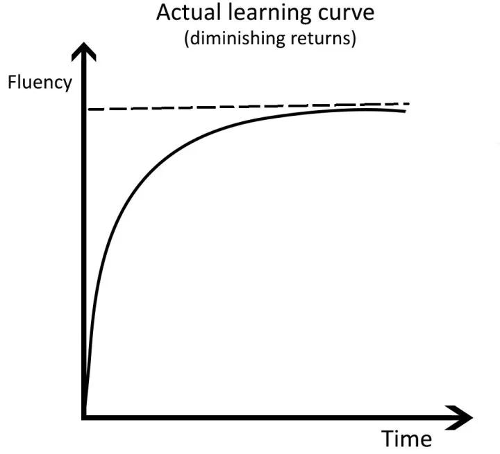 我们首先来看一个图示,这是英语口语的流利程度与学习时间的关系。