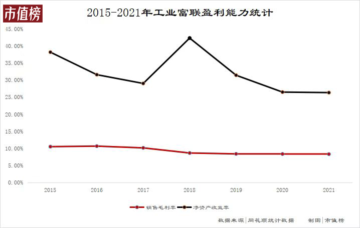 这么说不是因为富士康运营不正规,而是毛利太低了。根据富士康上市主体工业富联的财报,从2015年到现在,最高毛利率不超过11%,今年上半年只有6.5%,净资产收益率(加权)则从2015年的27.67%降至2021年的18.02%。