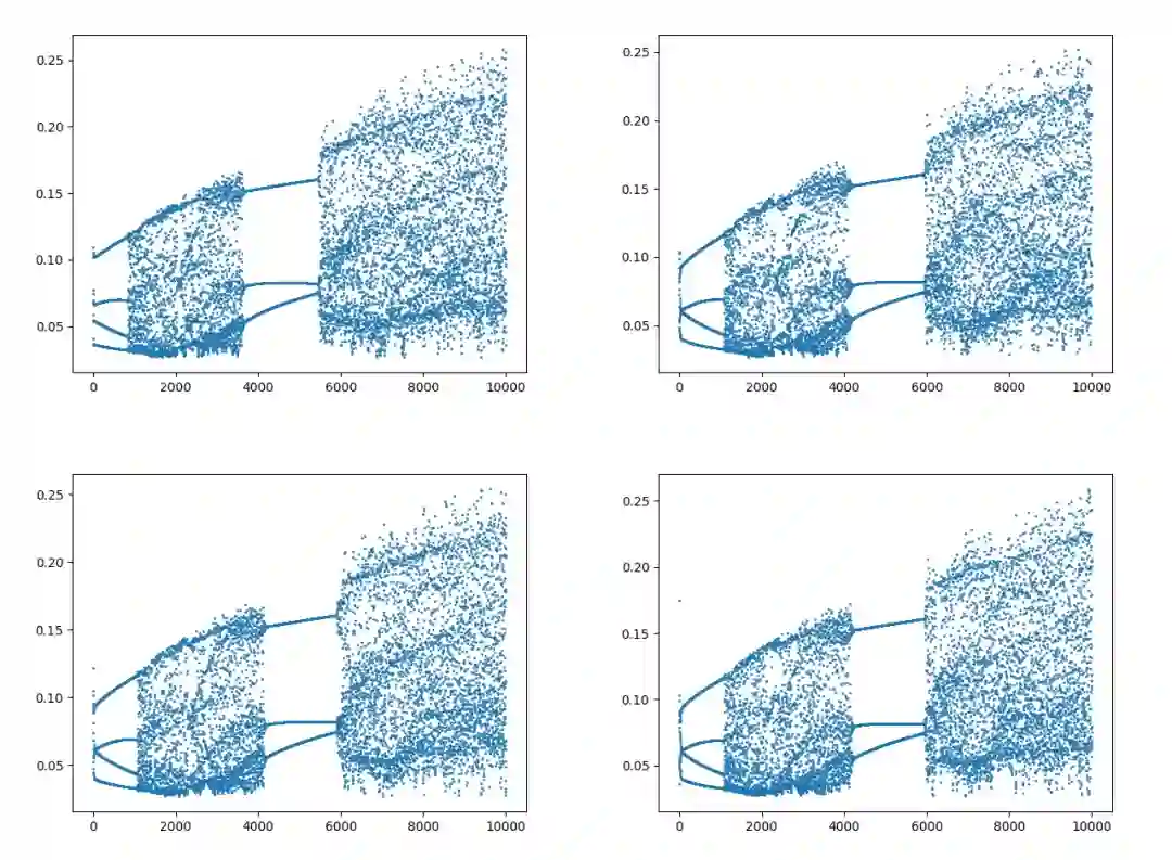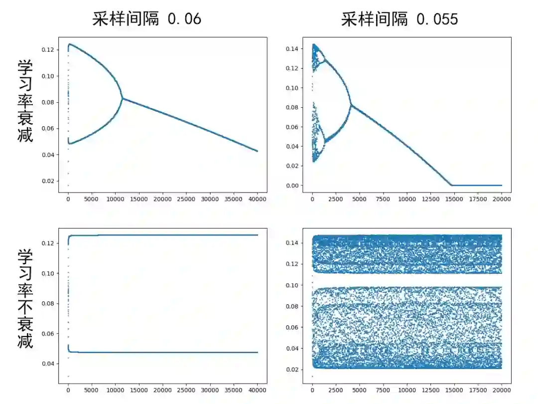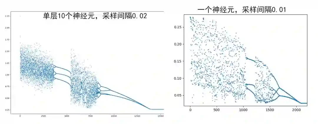 由此可以猜测,在一个优化问题中,目标附近的非谐效应(几乎总是存在)、过大的学习率和过慢的学习率下降是产生分岔和混沌的诱因。