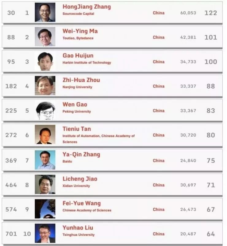 除了刚才已经提到的全球排名前 100 、分列中国籍学者前两位的张宏江、马维英之外,中国籍的学者 top 10 中的其它 8 位为: