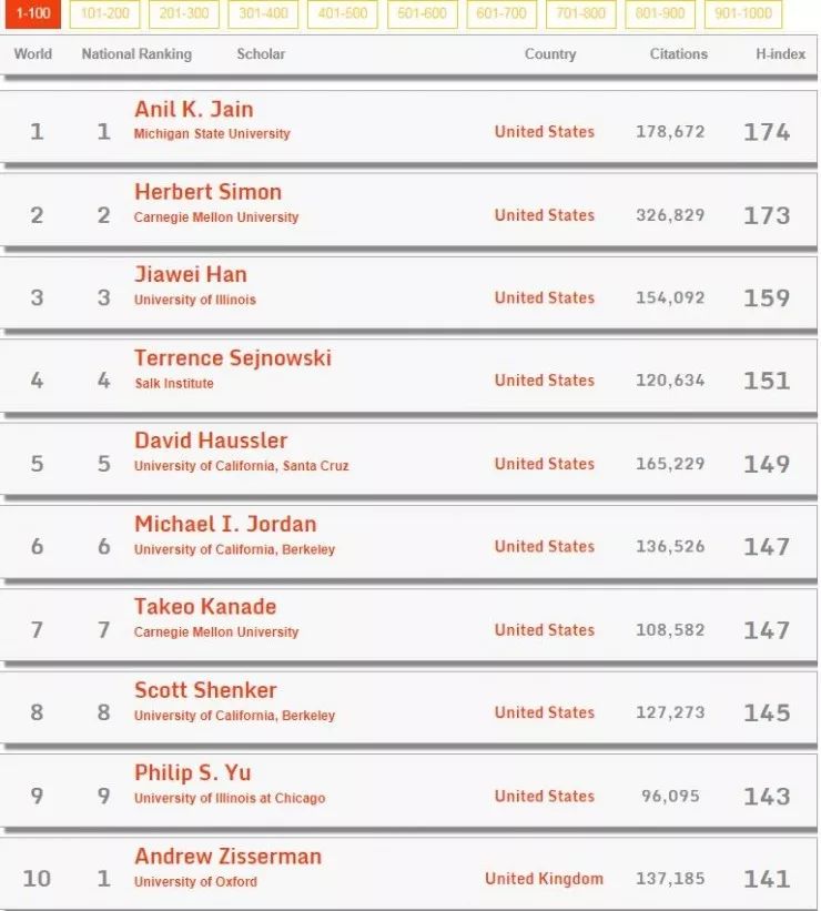 一眼就能看到的是,全球排名前 10 的学者里前 9 位都是美籍的,其中包括雷锋网 AI 科技评论非常熟悉的: