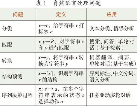 自然语言处理的问题从机器学习的角度可以归结为五大类,分别是分类、匹配、转换、结构预测、序列决策过程,如表1所示。深度学习使这五大类任务的正确率都有很大提升,特别是匹配和转换[5]。