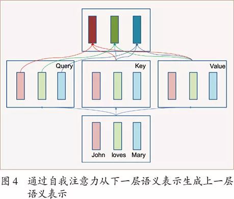 Transformer的编码器也是BERT的基本模型。给定一个句子,编码器可以生成其层次化的语义表示。每一个单词在每一层上有以这个单词为中心的语义表示(实数向量)。下一层的语义表示通过自我注意力(self-attention)生成上一层的语义表示。直观上每个单词的语义表示和其他所有单词的语义表示基于相似度组合成新的语义表示。比如,图4中“John”“loves”“Mary”三个单词各自有一个语义表示,在自我注意力中都成为查询、键、值。以每个单词的语义表示作为查询,以所有单词的语义表示作为键和值,通过注意力可以得到每个单词新的语义表示。这样一层层叠加,可以得到整个句子所有单词的语义表示。