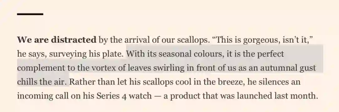 以对苹果设计负责人 Jony Ive 的报道为例。这是一位媒体排着队想采访的人物,网上几乎每隔几个月就会冒出一篇新的「深度专访」,连 钟表杂志 都想来分一杯羹。最初,我对这些访谈每篇必读,但不久就发现了不对劲:记者们仿佛形成了某种默契,在记述任何访谈的实质内容前,一定要先描绘一番 Ive 的衣着、谈吐以至步态,其窥探之细致让娱乐小报都叹为观止;行文过程中,一定要欲说还休地渲染出一种高贵感,并且假装不经意地消费一番 Ive 的英国爵士身份。最为极端的例子大概是去年 《金融时报》的版本,甚至写到了午餐时扇贝的颜色如何「呼应了秋风中起舞的枯叶」。从此以后,我对于苹果高管的访谈长文几乎都敬而远之了。