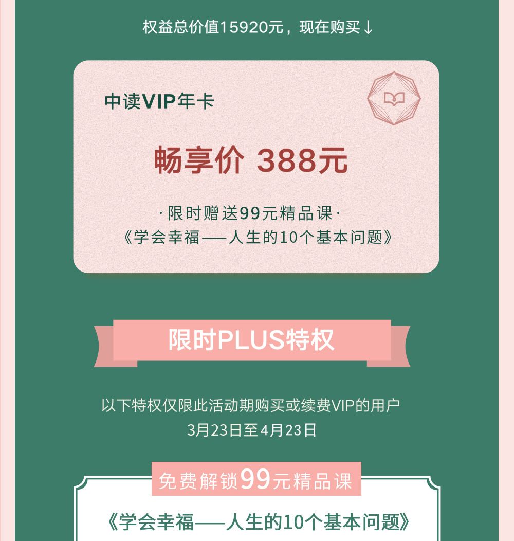 3月23日至4月23日期间,购买/续费中读VIP年卡即可免费领取课程,课程领取后永久有效。