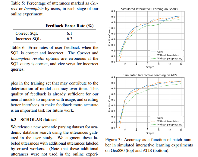 创新点:本论文提出了一种快速而容易地为新域构建数据库自然语言接口的方法,搭建了一个端到端的神经序列模型,将自然语言直接转换为SQL表示。然后将模型进行在线学习,通过线上部署,从而直接获取到用户的反馈,之后使用这个反馈来改善模型的效果
