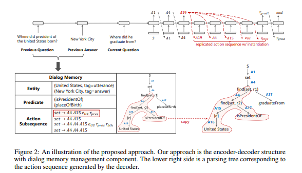 创新点:对话管理中的一个核心就是语义解析,本文提出了一种将自然语言转成逻辑表达形式的方法,引入了一个对话框内存管理组件,该组件在为当前对话生成逻辑表单时利用历史实体、谓词和操作子序列。为了避免训练期间在大规模知识库上重复执行的耗时情况,提前进行广度优先搜索算法,以获得能够产生正确答案的话语对及其动作序列,通过最大化产生预期动作序列的可能性来学习该模型。它可以很好的解决上下指代以及外来词的情况