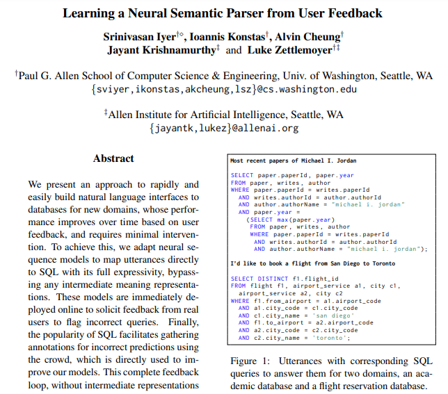 论文名称:Learning a Neural Semantic Parser from User Feedback