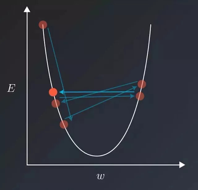 如果让人来走,可能就不一样了,你可能会先随便选一个方向,然后沿着这个方向的梯度向下走;过一会儿再随机换一个方向向下走;最后你发现自己差不多也到了谷底了。