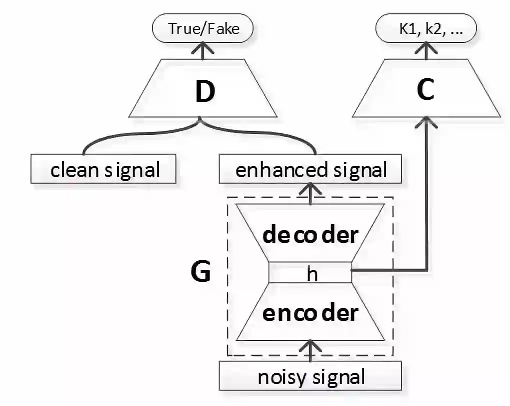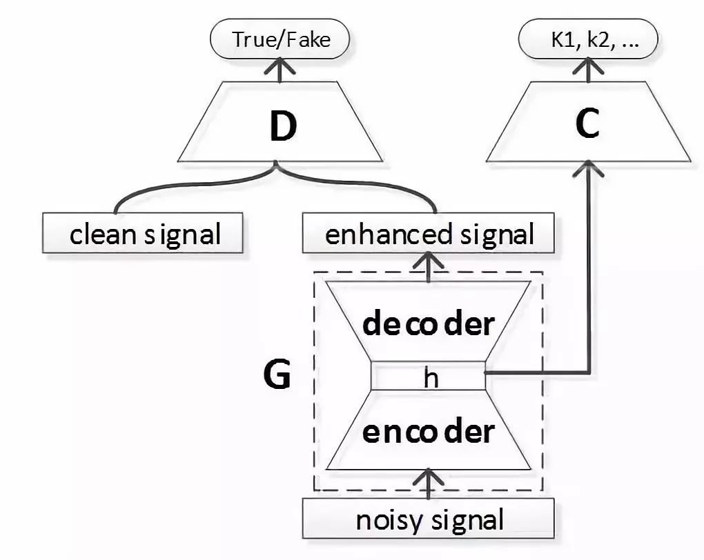 针对语音识别系统在噪声环境下识别性能下降的问题,自动化所智能交互团队提出了深度对抗和声学模型联合训练的框架。该框架由生成器(G)、判别器(D)以及分类器(C)组成。生成器用来把带噪语音数据分布变成纯净语音;判别器用来判定语音信号是否来自真实纯净训练集;声学模型作为分类器,指导生成器提取区分性特征。生成器、判别器和声学模型进行联合对抗训练,三者相互配合相互促进。