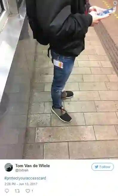 据外媒thenextweb报道,来自丹麦F-Secure的安全研究员Tom Van de Wiele近日展开了一项非常有趣的项目。这位出生在比利时的研究员拍下了人们将公司ID卡暴露在外面的照片并用#protectyouraccesscard(保护好你的门卡)的标签将它们分享到社交媒体平台上。