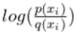 让我们看看 KL 散度各个部分的含义。首先看看项。如果 q(x_i) 大于 p(x_i) 会怎样呢?此时这个项的值为负,因为小于 1 的值的对数为负。另一方面,如果 q(x_i) 总是小于 p(x_i),那么该项的值为正。如果 p(x_i)=q(x_i) 则该项的值为 0。然后,为了使这个值为期望值,你要用 p(x_i) 来给这个对数项加权。也就是说,p(x_i) 有更高概率的匹配区域比低 p(x_i) 概率的匹配区域更加重要。