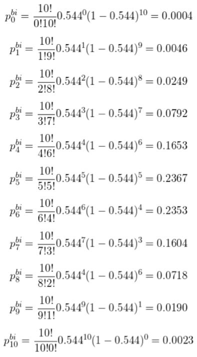 二项分布——n=10、p=0.544,k 取值在 0 到 10 之间。