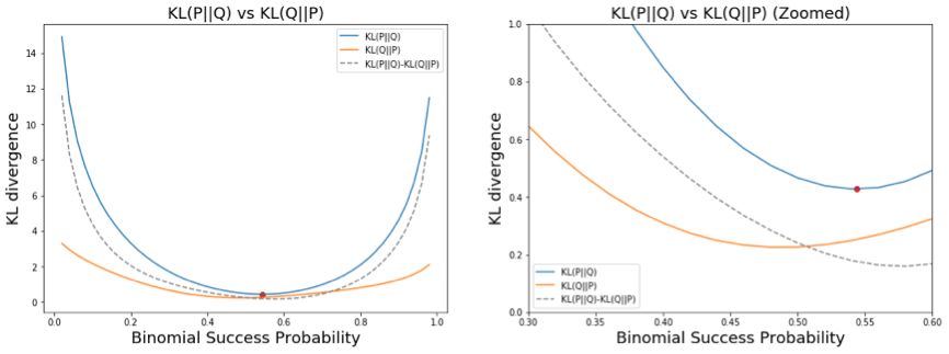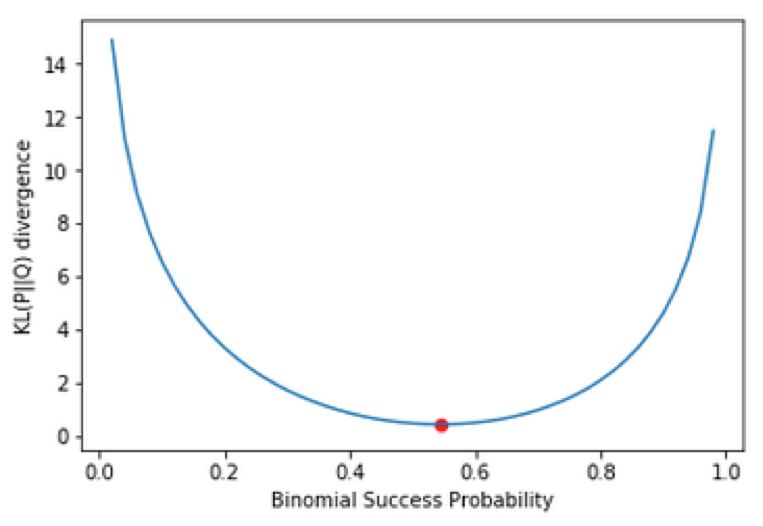 现在,我们来玩一玩 KL 散度。首先我们会先看看当二元分布的成功概率变化时 KL 散度的变化情况。不幸的是,我们不能使用均匀分布做同样的事,因为 n 固定时均匀分布的概率不会变化。