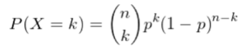 你可能计算过抛硬币正面或背面向上的概率,这就是一种二项分布概率。我们可以将同样的概念延展到我们的问题上。对于有两个可能输出的硬币,我们假设硬币正面向上的概率为 p,并且进行了 n 次尝试,那么其中成功 k 次的概率为: