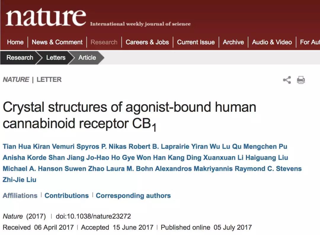 这一次,他们让别的科研团队再次抱憾。他们成功解析了大麻素受体与激动剂复合物的三维精细结构,2017年7月6日凌晨该项成果在国际顶尖学术期刊《自然》发表,并作为重点文章推介。同一个科研团队关于同一个蛋白的解析,先后在《细胞》《自然》上发表,也是绝无仅有的。