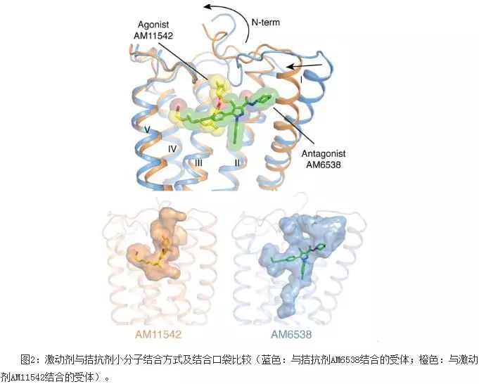 人源大麻素受体(CB1)与拮抗剂复合物的结构展示图。