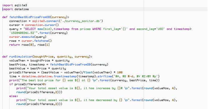 print(“The best bid price for {} was ${} at {} \n”.format(currency, bestPrice, time))