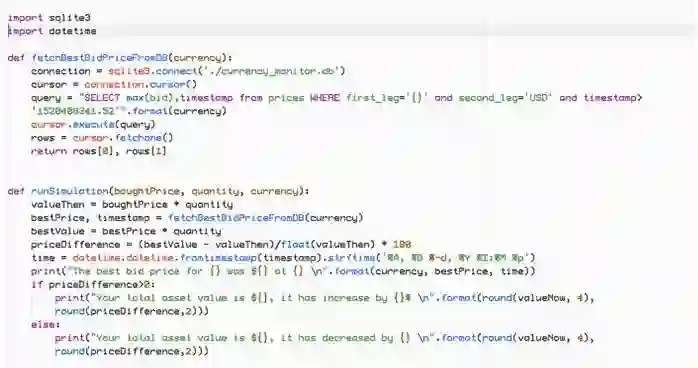 目前,模拟器会给出用户资产的最佳出仓价,并与其原始投资价格进行比较,然后告诉用户最终的盈亏状况。接下来,我将介绍如何添加对流通货币的价格监控,如何编写和测试交易策略,还有如何构建用户界面等等。
