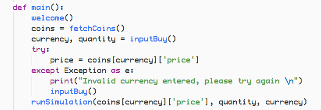 print(“{} — ${} \n”.format(coinAskPrice[0], round(coinAskPrice[1],4)))