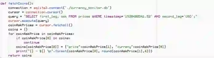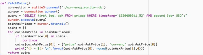 query = “SELECT max(bid),timestamp from prices WHERE first_leg=’{}’ and second_leg=’USD’ and timestamp> ‘1520408341.52’”.format(currency)