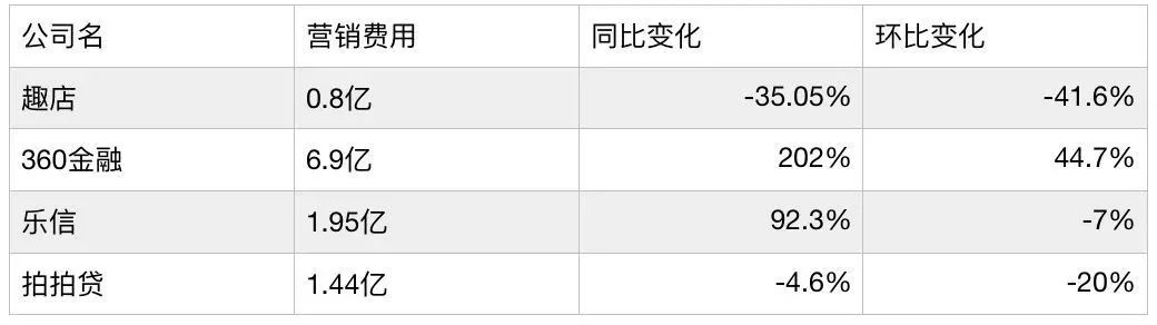 与此同时,我们在此前聊新金融上市公司一季报时就提到过,几家头部公司中,只有360金融一家加大了市场营销投入,其他几家都呈现保守收缩的态势。非上市公司们也遭遇「资本寒冬」,没有充足的「子弹」进行投放。