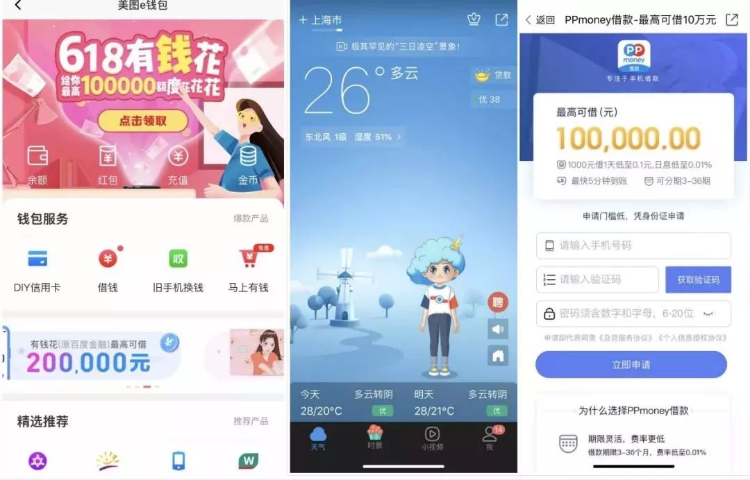 美图秀秀不仅在App内上线了「借钱」和「马上有钱」两个借款入口,还设置了多处banner为其他新金融平台导流,并将同样的入口直接复制到了「美拍」App上。此外,天气预报App墨迹天气悄然开放了与多家新金融平台的合作,在首页推荐贷款服务。