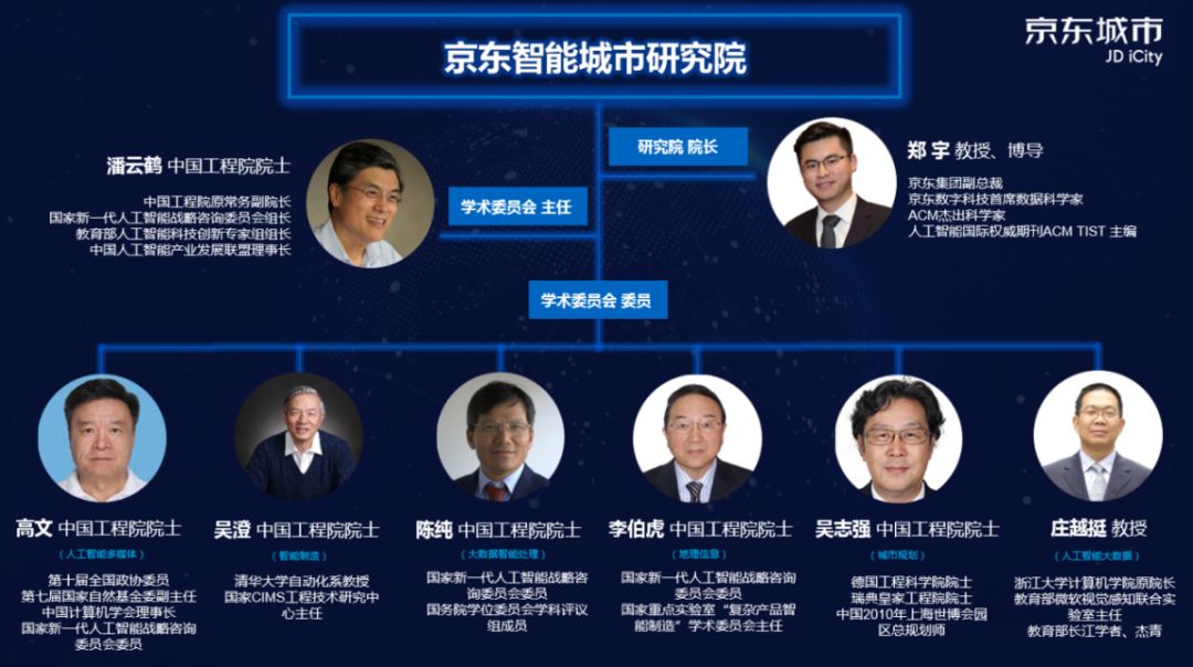 以京东智能城市研究院为例,院长郑宇是城市计算领域的先驱和奠基人,也是多所高校的客座教授。学术委员会主任则是中国工程院院士、中国工程院原常务副院长,国家新一代人工智能战略咨询委员会组长潘云鹤。此外,还有中国工程院院士高文、吴澄、陈纯、李伯虎、吴志强等坐阵。
