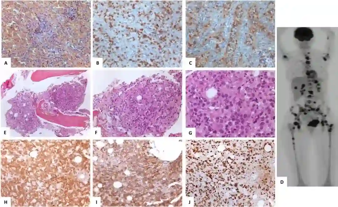 图2 病例2细胞学、细胞遗传学和病理学分析。A. 脾切除标本可见正常结构,小和中等不典型淋巴细胞浸润脾索和脾窦。B.脾窦内CD3+细胞。C.脾内肿瘤细胞,约60%为CD8+;18F-FDG- PET/CT见多个高代谢骨损害。E、F、G: 第三腰椎活检见大细胞浸润,核不规则,胞质丰富,轻度嗜碱,亦可见大的间变细胞。H、I、J.骨活检内的肿瘤细胞免疫组化示CD3+(G)、CD8+(H),核内弥漫性强表达P53(I)