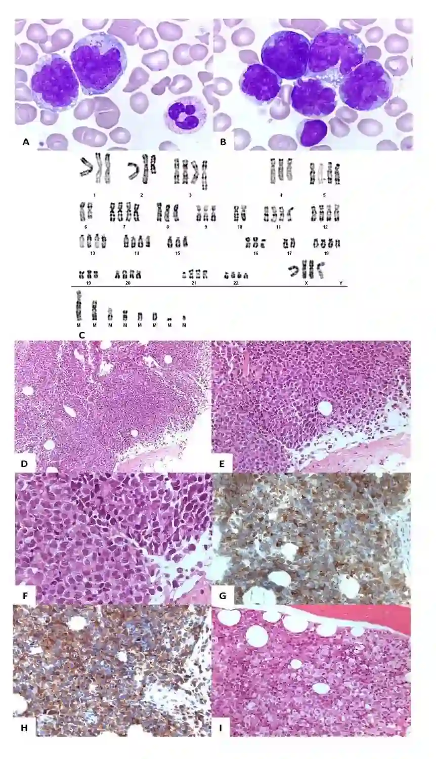 图1 病例1细胞遗传学和病理学分析。A、B.血涂片见大淋巴细胞,胞质丰富,中度嗜碱,含有颗粒和空泡,核不规则。C.复杂近4倍体核型,79~89,XXXX,-1,-2,add(2)(q23),-3,der(3)t(1;3)(q31;q27),-4,-6,-6,del(6)(q?q?),-8,-9,-10,-10,-15,-16,-17,-17,-19,i(21)(q10)x3,+7~14mar[cp16]。Ish 17p13.1 (TP53,17qtel)×2,mar(TP53-,17qtel++)×3[8]。D、E、F.淋巴结活检见中等和较大细胞弥漫性浸润,胞核不规则且多形性,胞质丰富。G、H. 免疫组化见肿瘤细胞CD3+和CD4+。I.骨髓内见到同样的细胞
