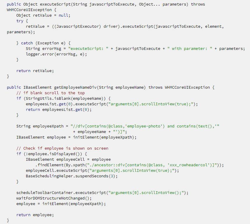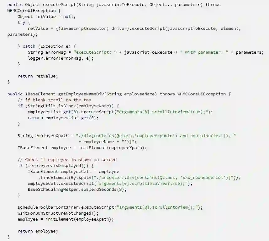 一、加强例框架研解决疑难技术点。例如在网页上查找employee元素,如果employee元素不在屏幕内,这时定位就会报错。 开发团队使用WebDriver JavaScriptExecutor的executeScript方法进行滚屏操作,很好的解决了这一问题。现在只需要调用getEmployeeNameDiv()方法,传入employeeName,就可返回要查找的employee元素: