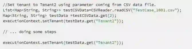 二、采用数据驱动测试的方法解决多租户测试需求。使用CSV来管理不同的测试数据集,只需装载一次测试数据文件,就可使用不同数据集多次执行测试用例,简化了用例开发量。例如切换租户只需要执行如下代码:
