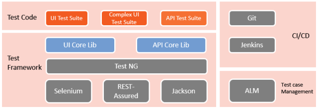 自动化测试用例集分为UI 测试, API 测试, 和混合场景测试。我们使用TestNG (版本6.8.8)、Selenium (版本2.53.0) 的WebDriver、REST-Assured(版本2.9.0)作为测试框架的核心工具。开发完成的自动化测试用例上传到Git仓库进行版本管理,由Jenkins进行CI/CD。测试用例生命周期及测试结果通过惠普的ALM (Application Lifecycle Management) 进行管理。 整体测试框架如下图: