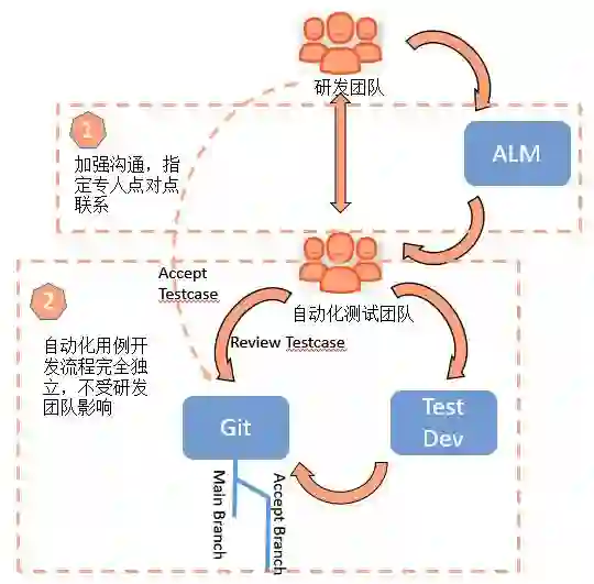 在Git中增加Accept分支,测试用例开发完成后在测试团队内部进行review,通过后提交到Git的Accept分支,研发团队每周定期review,接收开发好的测试用例并Merge到Main分支用于生产。
