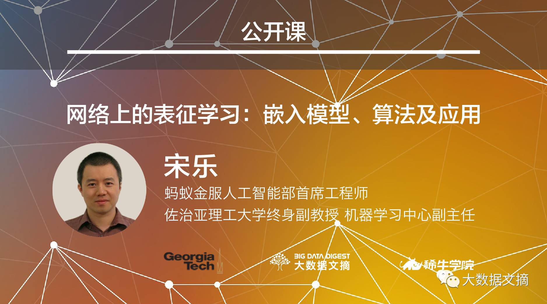 宋乐(Le Song)是蚂蚁金服人工智能部的首席工程师(Principle Engineer),同时也是佐治亚理工大学计算科学与工程系终身副教授,机器学习中心副主任。他于2008年在Alex Smola的指导下从悉尼大学和NICTA获得机器学习博士学位。2008年至2011年间,在卡内基梅隆大学机器学习系Eric Xing和Carlos Guestrin的指导下进行了博士后研究。在2011年加入佐治亚理工学院之前,他曾是一名Google的科学家。